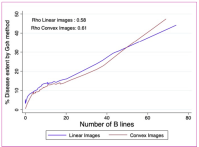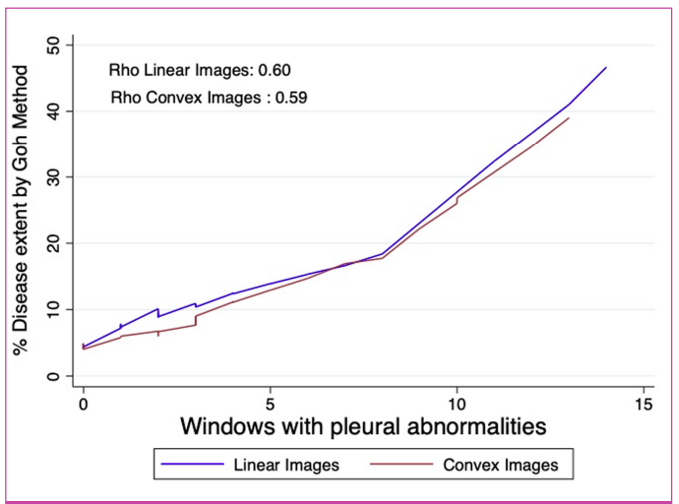When the number of lines and windows with pleural irregularity was included, a slight increase in the correlation with disease extent was observed, primarily in linear images (Rho = 0.75, P < .001) and lower in convex images (Rho= 0.64, P < .001).