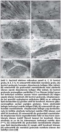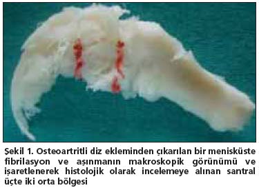 Yöntem ve Gereçler: Bu amaçla primer varus osteoartriti nedeniyle total diz artroplastisi yapılan dizlerden çıkarılan medial menisküsler incelendi. 20 menisküs ışık mikroskopunda ve transmisyon elektron mikroskobunda incelenerek 2 normal menisküsle karşılaştırıldı.