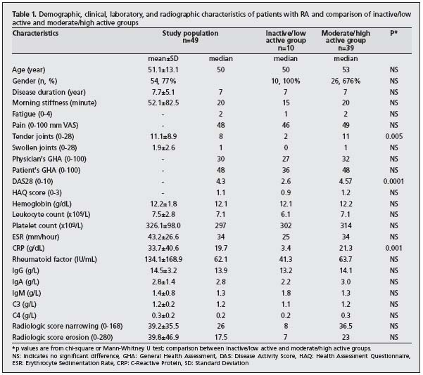 Materials and Methods: The study group consisted of 49 patients who fulfilled the 1987 American College of Rheumatology diagnostic criteria for RA, and 20 age- and gender-matched healthy controls. Morning stiffness (minutes), pain (visual analog scale, 0-100 mm VAS), fatigue (5-point scale), patient's and physician's general health assessment (0-100 mm VAS), number of tender and swollen joints (total 28 joints), disease activity (DAS28 score), and physical function capacity (disability) (Turkish version of the health assessment questionnaire, HAQ) were assessed. Presence of extraarticular manifestations was recorded. Radiographic assessment of hands and feet was evaluated according to the modified Sharp method. Routine laboratory tests, erythrocyte sedimentation rate (ESR), C-reactive protein (CRP), rheumatoid factor, immunoglobulins, and complements levels were determined by nephelometry. Serum sCD30 levels of the patients with RA and healthy controls were measured by ELISA.