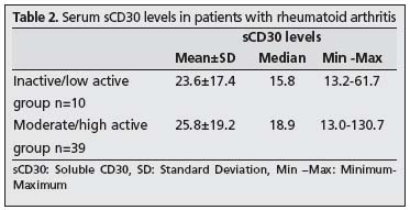 Results: The mean age was 51.1±13.1 years. The mean disease duration was 7.7±5.1 years. The median DAS28 score was 4.3 (2.3-6.8) and the median HAQ score 1.1 (0-3). The serum levels of sCD30 were significantly increased in RA patients (25.1±18.3 IU/ml) compared to healthy controls (17.2±8.1 IU/ml) (p=0.004). The mean serum level of sCD30 was not different between the low active and moderate/high active patient groups. There was a correlation between sCD30 level and extraarticular involvement (p=0.009, r=0.37) and physician's general health assessment (p=0.008, r=0.38).