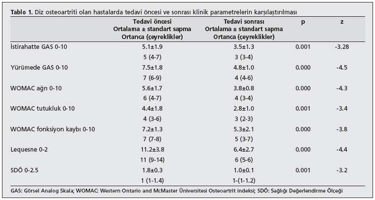 Bulgular: Tedavi öncesi ve sonrası değerlendirmelerde tüm parametrelerde anlamlı fark vardı (p <0.05). Tedavi sonrası ağrıda azalma, fonksiyonel aktivitede artış saptandı.