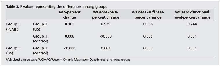 Results: VAS (p=0.005), WOMAC pain score (p=0.001), WOMAC joint stiffness score (p=0.027) and WOMAC functional level score (p=0.003) significantly improved in the first group. VAS (p=0.001), WOMAC pain scores (p=0.008), WOMAC stiffness scores (p=0.012) and WOMAC functional level (p=0.004) scores significantly improved in the second group as well. No change was observed in any assessment parameter in the third group (p>0.05). There were differences between groups regarding the percent change in VAS scores (p<0.001), WOMAC pain scores (p<0.001), WOMAC joint stiffness scores (p=0.013) and WOMAC functional level scores (p<0.001) after the treatments.