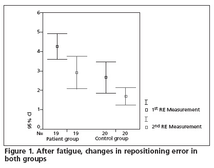 There were 19 males in the patient group and 20 males in the control group. All subjects were active persons who were involved in sports activities with irregular intervals. Comparisons between two groups are presented at Table 1. Differences in repositioning error before and after concentric exercise procedure between the groups were statistically significant (p<0.05) (Table 1). After fatigue, changes in repositioning error were found significant in both groups (p<0.05) (Figure 1).