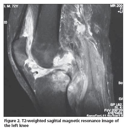 A 72-year-old male patient was admitted to our outpatient clinic with pain, swelling, and limited range of motion of the left knee, and difficulty in walking. His knee complaints had begun suddenly 1 year ago and he also had intermittent right hip joint pain. He had 1 hour of morning stiffness and his symptoms were slightly reduced by activity. He did not have any episodes of infections prior to symptom onset. He did not report fever, weight loss or sweating, and his rheumatologic history was uneventful other than his joint complaints. Despite the use of several non-steroidal anti-inflammatory drugs, there was no improvement in his knee pain, swelling, and range of motion. The anamnesis of the patient was unremarkable except he was treated for pulmonary TB 50 years ago and underwent surgery on his right hip due to trochanteric bursitis 3 years ago. On physical examination swelling and limited range of motion was observed in left knee. After activity, pain and increased temperature was also noted. His right hip joint motion was mildly painful without any limitation. Laboratory investigations revealed a white blood cell count of 6200/uL (normal range; 4800-10800/uL), hemoglobulin level of 12.8 mg/dL (normal range; 12-17 mg/dL), platelet count of 630.000/uL, erythrocyte sedimentation rate of 59 mm/h (normal range; 0-20 mm/h), blood glucose level of 110 mg/dL (normal range; 70-110 mg/dL), a C-reactive protein level of 8.99 mg/dL (normal value; <0.3 mg/dL), RF level of 63.70 IU/mL (normal value; <19 IU/mL), and anti-CCP antibody as 21.8 U/mL (normal value; 0-5 U/mL). The synovial fluid examination revealed a white blood cell count of 16.200/uL and a blood glucose level of 12 mg/dL. Marginal erosions were noted on the radiograph of the left knee (Figure 1). The anteroposterior pelvic radiograph revealed a region of ossification lateral to the right hip joint corresponding to the trochanteric bursa region. Magnetic resonance imaging (MRI) of the left knee revealed extensive hyperintense synovial thickening and erosive changes within the joint cavity, including all knee compartments and the suprapatellar bursa on T2-weighted images (Figures 2, 3). On contrast-enhanced MRI evaluation, fields of necrosis associated with infection showing peripheral enhancement were observed. Bone and joint pathologies defined in these investigations were compatible with infection. The differential diagnosis included arthritis, osteomyelitis, and especially TB, thus the Departments of Infectious Diseases, Chest Diseases, and Orthopedics were consulted. The Department of Infectious Diseases recommended that two consecutive joint aspiration samples should be screened for acid-resistant bacilli (ARB). Indeed, ARB were detected in both joint aspiration fluid samples. On lung tomography, as recommended by the Department of Chest Diseases, revealed fibrotic scars in the bilateral upper lobes, which were thought to be secondary to previous infection. Arthroscopic debridement was performed by the Department of Orthopedics and the biopsy result was compatible with a granulomatous inflammatory reaction. The patient was diagnosed with TB arthritis and treated accordingly. Clinical and laboratory improvement was noted on follow-up.