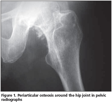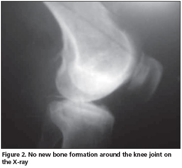 A 52-year-old female patient was admitted to our clinic with pain, swelling and limitation of motion in her left leg. It was learned that the patient underwent aortic valve replacement and aortoiliac bypass approximately 20 days ago. The patient was cooperative. She was brought to the outpatient clinic by stretcher. She described pain in the left thigh and leg, which increased when she tried to move her leg. Swelling was present approximately 5 cm above the left knee joint. There was no color change or spasticity. Deep tendon reflexes were normoactive. The knee and hip joint range of motion could not be evaluated because of severe pain. Laboratory examinations results were as follows: hemoglobin (Hb): 10.2 g/dl, hematocrit (Hct): 32%, white blood cell (WBC): 5200/mm3, platelet: 30, 000/mm3, erythrocyte sedimentation rate: 22 mm/h, C-reactive protein: 4, and alkaline phosphatase (ALP): 460 U/L. Other biochemical tests and urine tests were within normal limits. Periarticular osteosis areas were seen around the left hip joint in pelvic radiographs (Figure 1). No new bone formation around the knee joint was seen on the X-ray (Figure 2). In the left hip and knee bone scintigraphy, increased osteoblastic activity was considered as heterotopic ossification developing in two separate regions. The patient was started on passive joint range of motion exercises for the knee and hip joint. Cold pack on the hip and knee joints three times daily for 20 minutes was recommended. Indomethacin (75 mg/day) and etidronate disodium (400 mg/day) were given. Control of pain and decreased swelling were achieved after approximately 20 days, and increase in range of motion was detected. Joint range of motion and stretching exercises were continued with the rehabilitation, and the patient was recommended to continue treatment with etidronate disodium for three months.