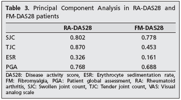 Result: The mean DAS28-4v score of the RA group was 3.63±1.52 (0.77-7.40) and of the FM group was 2.42±0.73 (0.57-3.86), and the difference between groups was statistically significant (p<0.001). In the Principal Component Analysis (PCA), in the RA group, the components that most affected DAS28-4v were TJC and SJC, while in the FM group, these were SJC and PGA. Significant differences were detected between the two groups in most SF-36 subgroups, except in the general mental health, social functioning and social role limitation subgroups. In the FM group, the physical function subgroup was significantly higher (p<0.001).