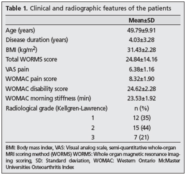 Materials and Methods: Ten men and 24 women between 30 and 60 years of age, who fulfilled the American College of Rheumatology (ACR) criteria for knee OA, were included in the study. All patients underwent MRI of the more symptomatic knee and the MRI findings were evaluated by the same radiologist blinded to clinical findings, using a semi-quantitative whole-organ MRI scoring method (WORMS). The Western Ontario and Mc-Master University (WOMAC) osteoarthritis index was used to assess physical function, morning stiffness, and joint pain.