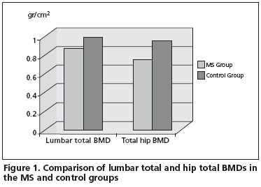 Materials and Methods: Twenty-two patients with MS (15 women, 7 men) and 22 age- and sex-matched subjects were enrolled into the study. Lumbar and femoral BMDs were measured using dual energy X-ray absorptiometry (DXA). Mobility and ambulation scales were also evaluated. Corticosteroid use was determined from an interviewer-administered questionnaire and patient records.