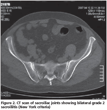 Cervical spine X-rays revealed flattening of the cervical lordosis with ankylosis and irregularity of the apophyseal joints at the C2-C5 level. Anterior and posterior syndesmophyte bridging with calcification of the spinal ligaments was observed on his thoracic spine radiographs. However, no radiological findings, except for flattening of the lumbar lordosis, were detected on the lumbar spine radiographs. The anteroposterior radiograph of the pelvis showed marked narrowing of the joint spaces and sclerosis on the acetabular surface of both hip joints. The computerized tomography (CT) scan of the sacroiliac joints revealed bilateral grade 2 sacroiliitis, according to the classical New York criteria (Figure 2).