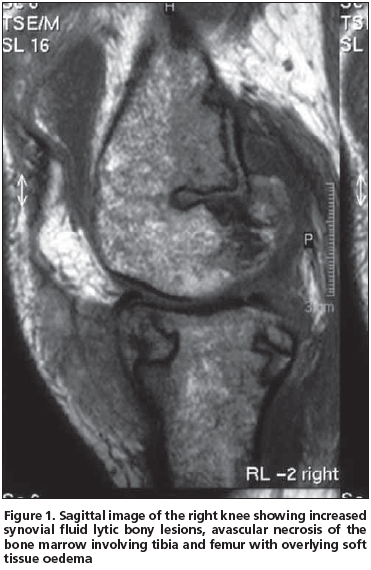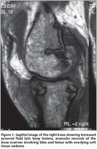 Arthralgia (or arthritis) is listed among the presenting symptoms of this triad in one- fourth of the cases[1,3,6-8] as was also observed in our patient. Between 50% and 88% of the patients have joint manifestations at some time during the syndrome[4,9]. Although metacarpophalangeals, knees and ankles are the most commonly affected sites[4,9], any joint can be involved, mimicking rheumatoid arthritis, gout and septic arthritis. Our patient's arthritis occurred in both knees. Although systemic manifestations of this syndrome may include polyserositis, mental status changes, medullary fat necrosis of long bones and aseptic necrosis of the bones were less frequently observed[1,4,7]. As mentioned, medullary fat necrosis of both femurs developed in our patient. The radiological appearance of medullary fat necrosis is characteristic, with osteolytic lesions and motheaten bone destruction and periostitis of the tubular bones of the extremities, which correlate pathologically with areas of extensive intramedullary fat necrosis and trabecular bone destruction.
