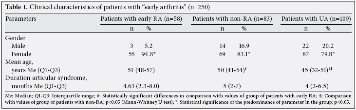 After taking results of the preliminary survey and initial examinations into account, patients with “early arthritis” were assigned to one of three groups: (i) early RA-58 (23.2%) patients, including four (1.6% of all patients) with probable RA, (ii) non-RA (other diagnosis)-83 (33.2%) patients: 55 (22%) cases of osteoarthritis, 23 (9.2%) cases of reactive arthritis, four (1.6%) cases of psoriatic arthropathy and one (0.4%) case of gout, and (iii) unspecified arthritis (UA)-109 (43.6%) patients. The clinical characteristics of patients are summarized in table 1. From the table it can be seen that women prevailed among patients with “early arthritis” in all three groups (p<0.001). The mean age of patients with early RА exceeded the mean ages of patients with other diagnoses and UA (p<0.05). The mean duration of an articulate syndrome was comparable for all three groups.
