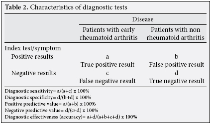 Patients and methods: The subjects were 250 outpatients (211 females, 39 males; mean age 46.1±11.8 years; range 19 to 73 years) with ”early arthritis”. The mean disease duration was 4.9±3.3 months. The criteria of inclusion of patients in the study were: (i) patients aged 18 years and older, (ii) clinical suspicion of RA according to EULAR (2002) criteria or persistent arthritis/arthralgia (>6 weeks), (iii) duration of disease <1 year, and (iv) written consent of the patient to participate in the study. The exclusion criteria were: (i) presence of a definite diagnosis of other rheumatic diseases before the onset of the study, and (ii) refusal of the patient to participate in the study. The diagnostic significance of the criteria was determined by the sensitivity and specificity. Predictive significance was estimated on positive and negative predictive values. The diagnostic effectiveness was also considered.