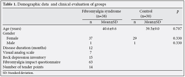 All patients completed the study. No statistically significant difference was found in gender between the groups (odds ratio=1.27). Thirty-three patients in the FMS group and 27 patients in the control group were married. The clinical evaluation of the FMS patients and control group is shown in table 1.