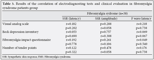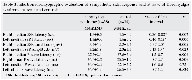 Patients and methods: Thirty-eight patients (1 male, 37 females; mean age 40.6±9.6; range 22 to 60 years) who were admitted to our clinic between March 2005 and March 2006 and diagnosed with FMS and 30 healthy controls (1 male, 29 females; mean age 39.5±9.0 years; range 22 to 55 years) were enrolled in this study. After clinical examination, all patients were evaluated in the electroneuromyography (ENMG) laboratory with respect to SSR and F wave. The F wave was measured in both median and ulnar nerves. The SSR was evaluated in the median nerve. Patients were assessed with respect to the mean value of the F wave distal latency, the distal latency for SSR and the amplitude values. All patients were also evaluated for pain (Visual analogue scale, VAS), number of tender points (NTP), depression (Beck depression inventory, BDI) and functional capacity (fibromyalgia impact questionnaire, FIQ).