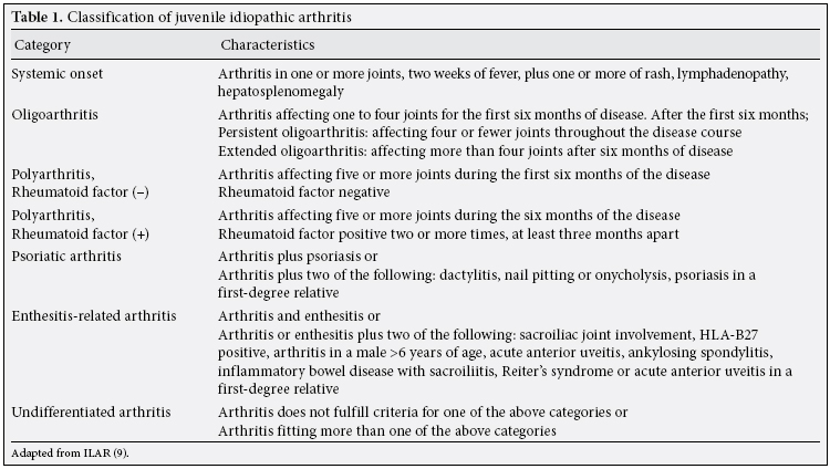 Juvenile idiopathic arthritis (JIA) is the most common chronic rheumatic disease in childhood with an incidence of 10-19/100.000 children below the age of 16 years, and it is also a major cause of acquired disability and impairment of quality of life in childhood.[1-5] The term JIA, like its predecessors juvenile rheumatoid arthritis and juvenile chronic arthritis, is an umbrella term for clinical patterns of arthritis in children.[6] By definition JIA encompasses a group of clinically heterogenous arthritides that begin prior to age 16 years, are of unknown cause,and present with joint pain, stiffness and swelling that persists for longer than six weeks.[1,7] According to the International League of Associations for Rheumatology (ILAR) classification, JIA is subdivided into seven categories which are different from each other and from adult rheumatoid arthritis (RA).[8,9] The ILAR classification is based on the number of joints affected, the presence or absence of specific serologic findings and systemic manifestations as outlined in table 1.