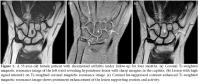 Conventional radiography of the wrist was acquired in the posteroanterior (PA) and semisupine projections. All the radiographs and MRIs were evaluated randomly and separately by a musculoskeletal system radiologist (GG with 6-year experience) at different times. Magnetic resonance imaging examination of the wrist was performed on both sides in six patients and on the dominant side in eight patients by a 1.5 Tesla MR (Magnetom Vision, Siemens, Medical Solutions, Erlangen, Germany) with surface coil. The examination site was 8 cm and set to encompass radioulnar, radiocarpal, midcarpal, and proximal metacarpal heads. Fat-suppressed and non-fat-supressed coronal and axial T1-weighted spin echo (SE) (TR 656 ms, TE 12 ms, slice thickness 3 mm, matrix 154x256, acquisitions 2), coronal fat-suppressed T2-weighted turbo spin echo (TSE) (TR 4000, TE 54, flip angle 180°, slice thickness 3 mm, matrix 140x256, acquisition 1) or coronal short inversion time inversion recovery (STIR) sequence (TR 5600, TE 30, TI 150, flip angle 180°, slice thickness 3 mm, matrix 140x256, acquisitions 2) and following delivery of 0.1 mmol/kg intravenous gadopentetate dimeglumine contrast agent, coronal fat-suppressed T1-weighted SE (TR 656 ms, TE 12 ms, slice thickness 3 mm, matrix 154x256, acquisitions 2) images, were acquired.