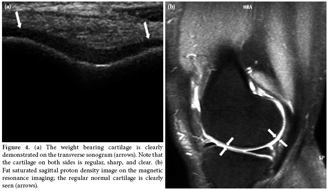 It is known that a normal femoral condylar cartilage has a clear, smooth and homogeneous hypoechoic appearance parallel to that of the cortical bone on US. Ultrasound has great potential to identify the normal cartilage and allows for differentiation of the abnormal morphology such as loss of clarity, irregularity, and defects on the surface.[7,19] We believe that in the present study, the high concordance rates with MRI have confirmed the accuracy of US in the assessment of cartilage morphology contrary to cartilage measurements.