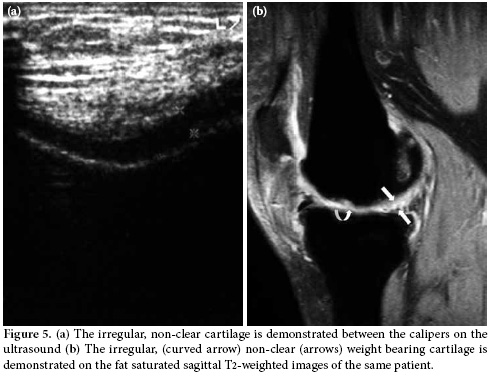 Results: In the comparisons of the results of US and MRI examinations, both modalities were mostly concordant. A significant rate of concordance was found between US and MRI results, for joint effusion (k=0.683, p<0.001) synovial proliferation (k=0.595, p<0.001), popliteal cysts (k=0.865, p<0.001) and tendonitis (k=0.889, p<0.001). On the US, the mean medial and lateral femoral condylar cartilage thickness was calculated as 2.1 mm on both sides, whereas the MRI revealed 1.8 mm on the medial and 1.9 mm on the lateral part. In the statistical analysis, the condylar cartilage was significantly thicker on the US than on the MRI (p<0.001). On the other hand, there was a significant correlation between two modalities regarding the cartilage morphology, both on the medial (k=0.658, p<0.001) and the lateral part (k=0.851, p<0.001).