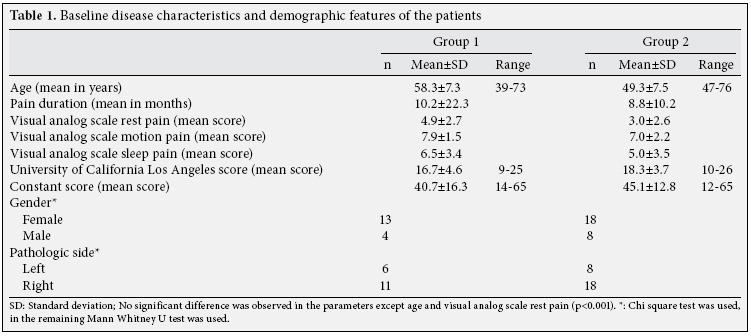 Magnetic resonance imaging findings revealed subacromial impingement syndrome stage I and II. Regarding the MRI findings, patients were allocated into two groups according to whether partial supraspinatus rupture was present (group 1; 13 females, 4 males; mean age 58.3±7.3 years) or not present (group 2; 18 females, 8 males; mean age 49.3±7.5 years). Exclusion criteria were the following: Zlatkin stage III with full thickness tears, positivity of drop arm test, shoulder instability, frozen shoulder, calcifying tendinitis, acute bursitis and steroid injection history to shoulder within three months, concomitant cervical radiculopathy, degenerative arthritis of the glenohumeral joint, shoulder instability and posttraumatic disorders.