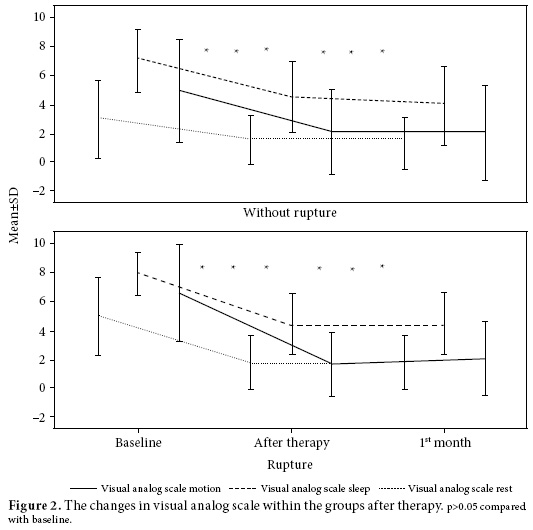 The duration of non-operative treatment has varied widely in the literature.[6,7] The duration of non-operative treatment is a clinical decision that should be based on the specific set of circumstances associated with the individual patient. Although conservative therapy periods can be generally lengthened for up to several months, there are some studies reporting positive short-term efficacy. In our study, we also observed short term efficacy on pain, function and ROM of SIS patients both with and without ruptures.