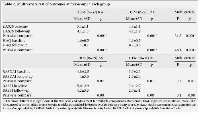 Objectives: We compared the inpatient rehabilitation model (IRM), provided by the physiatrist, physical therapist, rehabilitation nurse and clinical psychologist, with the home exercise model (HEM), provided by the physiatrist for the rehabilitation of patients with rheumatoid arthritis (RA) and ankylosing spondylitis (AS).