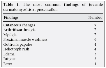 Results: The female to male ratio was 2:1. The median age at onset of the disease was 8.8 years (range 6.5-14 years), the median duration of symptoms before diagnosis was two months (range 10 days-72 months), and the mean time of follow-up was 49.5 months (range 2-96 months). The main presenting complaints were arthritis/arthralgia, myalgia, an impaired ability to walk, and skin rashes. Eight patients received oral steroids as the initial therapy. Additionally, two patients received intravenous methylprednisolone, and five received non-steroidal antiinflammatory drugs during the follow-up. Three patients received methotrexate, and one received cyclosporine A. The median time to treatment response was 60 days (range 10-70 days). Pathological proteinuria was found in two patients. Subcutaneous calcinosis developed in one patient. Skin and soft-tissue infections occurred in two patients. Other complications seen during the follow-up were malnutrition, obesity, depressive mood, ototoxicity, muscle weakness, osteoporosis, and contractures.