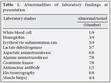 The onset of symptoms occurred during the winter (n=5), autumn (n=2), and summer (n=1). We could not determine the season when symptoms appeared in one patient. The median duration of symptoms before diagnosis was two months (range 10 days-72 months). The mean time of follow-up was 49.5 months (range, 2-96 months). The most common findings at presentation are summarized in table 1. At the time of admission, mean ± standard deviation (±SD) WBC counts were 7700±2700/mm3 (range 4600- 12700/mm3). The mean (±SD) level of hemoglobin was 12.6±1.2 g/dl (range 10.9-14.4). Five patients had an elevated ESR with a range of 53-200 mm/h. The median (min-max) level of LDH, AST, ALT and CK was 686 IU/l (range 146-3759 IU/l), 274 IU/l (range 57-1555 IU/l), 207 IU/l (range 34-564 IU/l), and 2938 IU/l (range 94-16408 IU/l), respectively. Antinuclear antibodies were seen in only one of the six patients tested. Electromyography was performed on eight patients which revealed typical myopathic type changes in all patients. A muscle biopsy was performed on four patients and was compatible with myositis (table 2).