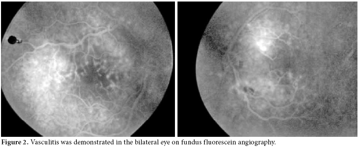 We found that one of our patients had retinal vasculitis. Retinopathy is very rarely observed in dermatomyositis (DM) and JDM.[10] There are a few case reports about retinopathy in JDM.[11-13] Furthermore, Akikusa et al.[14] recently retrospectively studied the eye involvement in 82 patients with JDM. Two of these patients were found to have retinopathy. In a case report regarding a 14-year-old patient with JDM reported by Wienfield, retinopathy presented with transient visual loss.[11] In our case, the patient had no sign of retinopathy. It has also been reported that retinopathy leads to irreversible visual loss.[15] Although retinopathy is rarely observed in patients with JDM, periodic eye examinations should be performed since retinopathy may lead to the persistent loss of vision which would affect the quality of life.