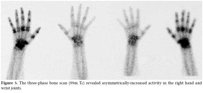 All of the laboratory test values (hemogram, routine biochemistry, C-reactive protein, and rheumatoid factor) were within normal limits. Radiographs of both hands and wrists (figure 2) were also found to be normal. After these results, a three-phase bone scan (Technetium-99m) was obtained. It showed diffuse increased uptake and hyperemia in the right wrist in the first phase, and diffusely increased uptake in the right wrist, metacarpals, and phalanges in the third phase (figure 3). The appearance was scintigraphically compatible with CRPS.