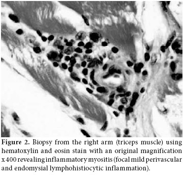 In December 2009, the adalimumab frequency was decreased to once per month. As the patient wanted to conceive, a slow tapering of her methotrexate dosage was started with a plan of reaching 7.5 mg/week over a threemonth period followed by complete discontinuation for at least three months prior to conception. In April 2010, she presented with symptoms of profound weight loss, night sweats, intermittent fevers, and a sore throat. She had stopped the methotrexate and adalimumab during her febrile episodes. She did not have any clinical signs of active arthritis, and there was no lymph node enlargement. She had a high CRP rate of 42 mg/L, leukopenia of 2.63x103g/L, and lymphopenia of 0.86x103 g/L. All tests to rule out infection were negative, including blood, urine, and stool cultures. Brucella titer, malaria, schistosomiasis, human immunodeficiency virus (HIV), Epstein-Barr virus (EBV), and cytomegalovirus (CMV) serologies were all negative. Computed tomography (CT) scans of the head, neck, paranasal sinuses, chest, abdomen, and pelvis were all within normal limits, as well. She was kept on naproxen and paracetamol to control her pain and fever and also received a course of oral antibiotics from a local facility for presumed pharyngitis. An otolaryngology (ENT) referral failed to demonstrate an etiology for her symptoms. Three weeks later, she presented with diffuse muscle weakness, which was mainly proximal rather than distal. She was unable to get out of bed, climb stairs, or even stand from a sitting position. She had signs of active arthritis in two metacarpophalangeal (MCP) joints in the right and bilateral wrist joints. She had a mild hyperpigmented area around the mouth, but no skin rashes elsewhere. The results of respiratory and cardiac examinations were normal. After admission to the hospital, further tests ruled out thyroid and adrenal disorders. The ANA titer was 1:1280, and the anti-ds DNA was 27.5 U/ml (normal value 0-20 U/ml). Her CRP level was high at 56 mg/L while her creatinine kinase (CK) level was entirely normal. Electromyography (EMG) showed the presence of spontaneous activities suggestive of inflammatory myopathy. Magnetic resonance imaging (MRI) of the right arm showed mild edema involving the right triceps muscle with minimal enhancement in the post contrast sequence (Figure 1). Biopsies of both the right arm (triceps muscle) and right thigh (vastus lateralis muscle) were taken, and the MRI of the right arm revealed inflammatory myositis (focal mild perivascular and endomysial lymphohistiocytic inflammation), (Figure 2). The MRI of the thigh was normal. She was diagnosed with a case of adalimumab-induced lupus myositis and received 1 gm of methylprednisolone intravenously daily for three days. She was then maintained on 60 mg per day for 28 days. Given her profound weakness, rituximab 1000 mg was given intravenously and was well tolerated. She was discharged on May 31, 2010 and continued taking prednisone 60 mg per day. Two weeks later, she received another dose of rituximab 1000 mg. She was maintained then on a tapering regimen of prednisone, azothioprine 50 mg twice daily, hydroxychloroquine 200 mg twice daily, plus calcium and vitamin D. During her last assessment eight months later, she was asymptomatic with normal muscle strength, CRP, anti-dsDNA (11U/ml), and ANA titer (1:360) and was no longer on steroids.