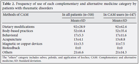 Patients and methods: We conducted face-to-face interviews with 318 patients with rheumatic diseases (212 females, 106 males; mean age 48.0±15.1 years; range 18 to 79 years) regarding demographic variables, history of CAM use, preferred CAM methods and resources of information encouraging patients using CAM. Complementary and alternative medicine methods were categorized as follows; 1- Acupuncture, 2- Biofeedback, 3- Dietary modifications, 4- Body-based practices, 5- Magnetic or copper devices, 6- Behavioural methods, 7- Others.