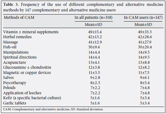 A total of 318 patients with rheumatic disorders completed the questionnaire. The demographic and clinical characteristics of the patients are summarized in Table 1. Approximately one half (46.2%) of the patients had experience with at least one type of CAM method. There was no difference in the frequency of CAM methods used among patients from the three different cities (data not shown). The mean age of CAM users and non-users was similar (p=0.156). There was no significant difference in terms of gender between CAM users and nonusers. However, the frequency of CAM use tended to be higher among females compared with males (50.5% versus 39.6%, respectively; p=0.095). Patients with a higher education level (more than 11 years of education) tended to use CAM more frequently than patients with a lower education level, but the difference did not reach a statistically significant level (64% and 44.7%, respectively; p=0.063). The patients with non-inflammatory or degenerative disorders, including osteoarthritis, fibromyalgia, chronic low back pain, and chronic neck pain, experienced CAM more frequently than the patients with inflammatory disorders, such as rheumatoid arthritis, spondyloarthropathies, connective tissue diseases, vasculitis, and familial Mediterranean fever (p=0.023).