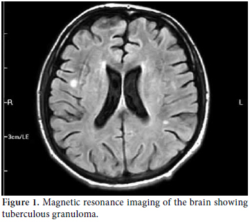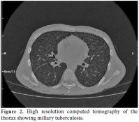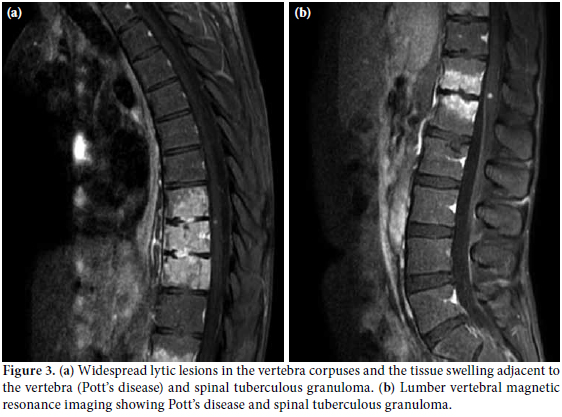 A 22-year-old male patient was presented to the emergency room of our hospital with complaints of fever, headache, and fatigue which had been occurring for 10 days. The medical history revealed that he had been diagnosed as having Behçet’s disease in 2007 and had been using prednisolone since the time of diagnosis. The dosage of prednisolone was increased up to 64 mg/day by the supervising clinician. Cyclosporine-A had been added to the treatment at 100 mg/day two months previously due to eye involvement but was discontinued after one week due to side effects of fever, fatigue, and headache. The patient was prescribed azathioprine at 100 mg/day on the follow-up visit, and he had been using this drug for nearly 10 days prior to being admitted to our hospital. The physical examination findings revealed a body temperature of 39.8 °C, arterial blood pressure of 110/70 mmHg, and a heart rate of 112/per minute. Neck stiffness was minimally positive. He had swelling and sensitivity on palpation in the right scrotal region that had started three months earlier. Laboratory examinations were as follows: leukocyte count 7.400/mm3, erythrocyte sedimentation rate 87 mm/h, C-reactive protein: 13.4 mg/dl in cerebrospinal fluid (CSF) analysis, leukocyte count: 20/mm3, protein: 200 mg/dL, and glucose: 27 mg/dL (blood glucose: 94 mg/dL). There was no growth on the CSF culture. A chest X-ray was normal. Since the CSF findings and physical examination results could not rule out bacterial meningitis, he was started on ceftriaxone 2x2 gr intravenously. He had no regression of complaints in the first week of treatment, and his antibiotic treatment was discontinued. Internal disease and neurology consultations in conjunction with the clinical findings and CSF results led to a diagnosis of neuro-Behçet’s disease. Scrotal ultrasound screening was consistent with epididymitis. A large number of leukocytes were observed in the material aspirated from the testis (90% lymphocyte in nature). Ehrlich- Ziehl-Neelsen (EZN) staining detected acid-resistant bacteria. Treatment with isoniazid, ethambutol, pyrazinamide, and rifampicin was initiated under the diagnosis of testis tuberculosis. Subsequently, chest high resolution computed tomography (HRCT) and brain magnetic resonance imaging (MRI) were done. The chest HRCT result was consistent with miliary tuberculosis (Figure 1), and the brain MRI revealed findings were consistent with tuberculous granuloma and tuberculous meningitis (Figure 2). The vertebral MRI showed that widespread lytic lesions in the vertebra corpuses and the tissue swelling adjacent to the vertebra were consistent with Pott’s disease and spinal granuloma (Figure 3a and 3b). Based on these examinations, the patient was considered to have disseminated tuberculosis (testicular tuberculosis, miliary tuberculosis, tuberculosis meningitis, spinal granuloma, and Pott’s disease). The anti-tuberculous treatment was revised with the ethambutol being replaced by streptomycin. The patient’s body temperature returned to normal on the eighth day of treatment. The patient, whose general condition was observed to improve, is still receiving the treatment.