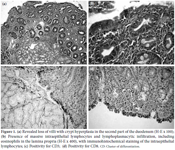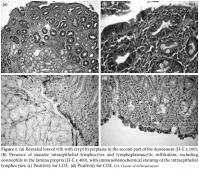 A 26-year-old primipara presented with complaints of cramps in her hands and feet which began one month after the birth of a 1800 g low-birth-weight infant at 30 weeks gestation. She had had these symptoms for one month. The physical examination of the patient, who had lost more than 10% of her body weight (6 kg) in one month, revealed a positive Chvostek’s sign and a negative Trousseau’s sign. The results of the laboratory examination were as follows: serum calcium 6.8 mg/dL (8.2-10.5 mg/dL); phosphorus 4 mg/dL (2.5-4.8 mg/dL); albumin 3.6 g/dL (3.5-5.2 g/dL); parathormone (PTH) 144.7 pg/mL (15- 65 pg/mL); 25-hydroxy vitamin D 25(OH)D 9 ng/mL (<10 ng/ml indicates severe deficiency); potassium 3.5 mEq/L (3.5-5.5 mEq/L); hemoglobin 11.8 g/dL; hematocrit 37.5%; ferritin 20.92 ng/mL (5-148 ng/mL); and vitamin B12 193 pg/mL (193-982 pg/mL). The levels of blood urea nitrogen (BUN), serum creatinine, thyroid-stimulating hormone, aspartate transaminase, alanine transaminase, alkaline phosphatase, creatine kinase (CK), amylase, and bilirubin along with the leukocyte count were normal. The total T and Z scores of the vertebrae by dual energy X-ray absorptiometry were -2.9 and -2.8, respectively, and the total T and Z scores of the femur were both -3.4. The patient declined a bone biopsy planned for the diagnosis of suspected osteomalacia. The anti-endomysium (1/100 titer) and anti-gliadin (1/100 titer) immunoglobulin A (IgA) antibodies were positive. Endoscopically, there was a granular and nodular appearance in the second part of the duodenum and bulbous. Biopsies obtained from the duodenum revealed a loss of villi, the presence of massive intraepithelial lymphocytes, and lymphoplasmacytic infiltration, including eosinophils in the lamina propria. Immunohistochemically, the intraepithelial lymphocytes stained positively for cluster of differentiation (CD)3 and CD8 but negatively for CD4 and CD20. According to the modified Marsh classification,[5] the results were consistent with CD, type 3B (Figure 1). A gluten-free diet was initiated, and oral calcium and vitamin D were administered to the patient. The complaints of cramps in her hands and feet resolved after the first week of the gluten-free diet. The calcium and PTH levels of the patient, who gained 5 kg in the second month of therapy, are now within normal ranges, and she is undergoing follow-up care.
