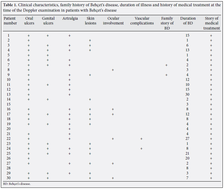 The study group consisted of 30 patients with BD who were monitored at the Departments of the Dermatology and Urology at Gaziosmapasa University Hospital. The patients had been diagnosed with BD at our clinics and other hospitals. All of the patients fulfilled the criteria of the International Study Group for BD.[14] The control group included 25 healthy volunteers who were recruited from the hospital staff. Atherosclerotic risk factors including hypertension, hypercholesterolemia, smoking, diabetes mellitus (DM), and relevant family history were recorded. In the study group, patients were questioned regarding the clinical characteristics, duration of illness, and medical treatments received at the time of the examination and during the previous month (Table 1). Patients with BD were divided into two subgroups according to the median duration of the disease and disease activity state (active and inactive). At the time of examination, patients were included in the active group if they had at least two of the following clinical criteria: oral ulcers, genital ulcers, ocular involvement, arthralgia, or vascular complications.[15]