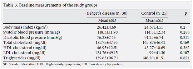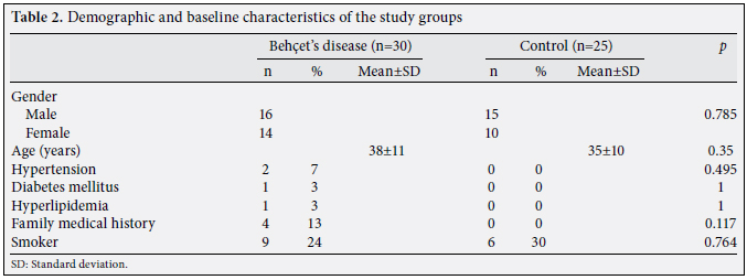 The control subjects and patients with BD were comparable in terms of age (35±10 versus 38±11, respectively; p=0.35) and gender (15 males and 10 females versus 16 males, and 14 females, respectively; p=0.785). No statistical differences were seen in the atherosclerotic risk factors between the two groups (Table 2).