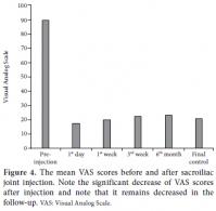 Results: The mean follow-up was 26.7 months (range 24 to 36 months). Eight out of 46 patients (17.4%) needed a second injection. Five of them (10.8%) failed to show improvement during the follow-up after the intraarticular cortisone injection. The overall success rate of the SIJ injection was 89.2%. The differences between the VAS scores before the injection and at intervals of one day, one week, three weeks, and six months were significantly lower. This response remained significant after a minimum of two years of follow-up with a median VAS score of 20.5 (min-max: 0-87).