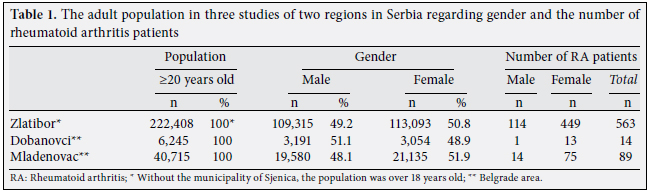 The total number of adult inhabitants and the number of male and female patients in the three studies is presented on Table 1. In the Zlatibor region, 563 persons with RA (114 males and 449 females with a male to female ratio of 1:4) were included in the registry and treated. Moreover, 388 of those patients (70 males and 318 females) received treatment in the hospital.