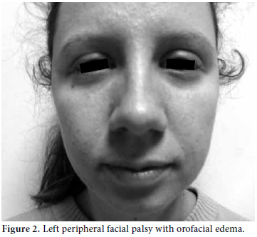 A 23-year-old, right-handed female was admitted to our outpatient neurology clinic with recurrent peripheral facial palsy that took place three times a year. She was suffering from hair loss and had a history of oral aphthous ulcers that relapsed once a year. She had no remarkable family history of any rheumatoid disease. On physical examination, her general condition was good, and she had no oral or genital aphthous ulcers or lesions. There were bilateral, macular, hyperpigmented annular plaques located approximately 10 cm proximal to the distal leg, laterally. She had mild orofacial edema at the left side of the upper lip and malar region beginning from the upper eyelid. In addition, she had a furrowed and fissured tongue (Figure 1). Her neurological examination was normal except for left peripheral facial palsy with orofacial edema (Figure 2). Cranial magnetic resonance imaging (MRI) and angiography were normal. Laboratory investigations, including complete blood count (CBC), liver and kidney thyroid function tests, an electrolytes test, and thyroid function tests, showed no abnormalites, and serum vitamin B12, IgE and amylase levels were normal. The antinuclear antibody (ANA) test showed a homogenous pattern, and three were positive in the nucleolar pattern. Moreover, an extractable nuclear antigens (ENA) profile was nucleosome 1 positive. Tests for anti-neutrophil cytoplasmic antibody (ANCA) and anti-cardiolipin antibodies (IgM and IgG) with anti-DNA antibodies were negative. Components of the complement cascade, such as C4, were decreased (13.50; normal range 15-50), whereas C3 was normal (119; normal range 85-200). There were heterozygote mutations in Factor V Leiden, plasminogen activator inhibitor-1 (PAI-1) 5G-4G, and angiotensin-converting enzyme (ACE) insertion/deletion (I/D). We treated the patient with 1 mg/kg/day oral prednisolone at 60 mg/day for five days, which was reduced to 50 mg/day for five additional days. Thereafter the dosage was reduced by 10 mg per week. Currently, the patient is still under the care of our outpatient neurology clinic as she is being monitored via follow-up visits.