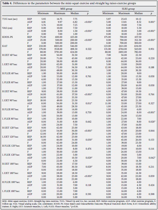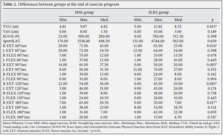 The MSE group had significantly lower TUG test scores and higher torque for right knee extension at 60°/sec (p=0.024), 90°/sec (p=0.003), 120°/sec (p=0.005) and 180°/sec (p=0.017) than the SLRE group at the end of the exercise program (Table 2, 3).