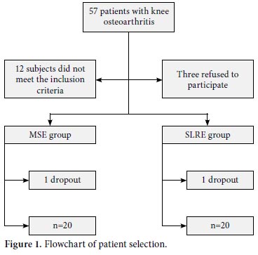 Patients and methods: Forty female patients (mean age 59.93±10.61 years; range 30-65 years) who were admitted to Başkent University Hospital between February 2009 and February 2010 with bilateral knee OA were included in this randomized controlled double-blind clinical trial. The patients were assigned into two groups, including SLRE and MSE. Both exercise groups were scheduled for a threeweek program of five sessions per week. Both groups also received an electrotherapy program in each session. Knee pain using the visual analog scale (VAS), physical performance using Timed Up and Go (TUG) Test, isokinetic quadriceps and hamstring muscle strengths using Cybex II, static balance using SportKAT 3000, physical function using Knee Injury and Osteoarhtritis Outcome Score-Physical Function Short Form (KOOS-PS) were assessed at baseline, at treatment end, and one month after treatment end.