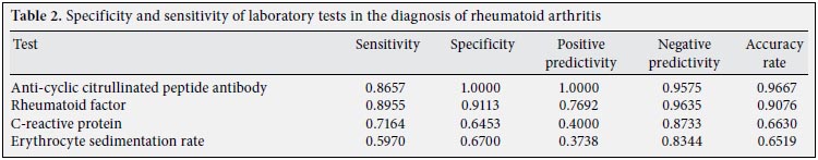 According to the calculations based on RA diagnosis, it was observed that anti-CCP also had the highest specificity when considering all of the tests studied in this context. The values of anti-CCP were as follows: sensitivity= 0.8657, specificity= 1.0, positive predictivity= 1.0, negative predictivity= 0.9575, and accuracy= 0.9667. Calculations for the other test data is summarized in Table 2.