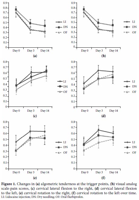 Patients and methods: A total of 60 patients (7 males, 53 females; mean age 33.7 years; range 18 to 50 years) were included in this prospective study. The patients were divided into three groups by block randomization. Each group was assigned to dry needling for trigger points, lidocaine injection (double blind) or oral flurbiprofen 200 mg/day over seven days. All patients were also prescribed a standardized home exercise program based on stretching of the affected muscles. Before treatment and on the third and 14 days after treatment, pain severity was assessed by visual analog scale (VAS), degree of tenderness at the trigger points by algometry, active joint range of motion of the neck and shoulders by goniometry, and the quality of life by Nottingham Health Profile.