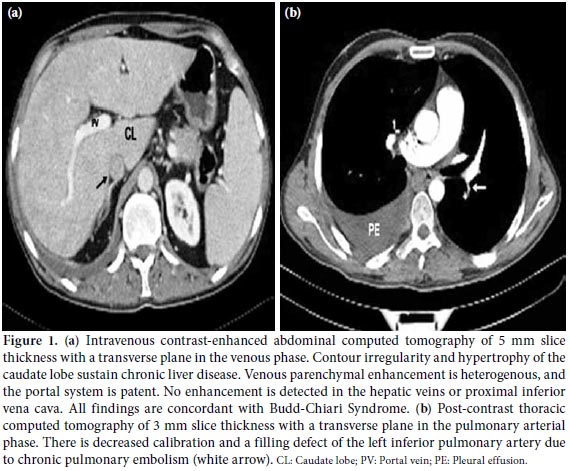 A 29-year-old male patient with BD was admitted to our clinic with dyspnea, palpitations, and chest pain. The diagnosis had been established three years earlier on the basis of mucocutaneous lesions and gastrointestinal disorders. The patient had then been treated with colchicine and corticosteroids. His past medical history also included deep venous thrombosis (DVT) in his calf. On his physical examination, a left parasternal murmur resembling the sound of a machine was detected along with abdominal ascites. His electrocardiography (ECG) and chest X-ray results were normal. Post-contrast thoracic computed tomography (CT) revealed right pulmonary effusion and decreased calibration together with a filling defect of the left inferior pulmonary artery due to a chronic PE (Figure 1a). On the abdominal ultrasononography, hepatic venous thrombosis was detected. The portal venous system was patent, but no enhancement was detected in the hepatic veins or proximal inferior vena cava (IVA) on the abdominal CT. The findings were concordant with BCS (Figure 1a). Two-dimensional transthoracic echocardiography revealed a mass on the right atrium protruding into the right ventricle (Figure 2a). The suprasternal view showed a turbulent and abnormal flow surrounding the arcus aorta and pulmonary artery (Figure 2b). Doppler interrogation demonstrated a continuous flow signal at that location. In addition, coronary angiography was performed to evaluate coronary involvement because of intractable angina pectoris, and a coronary arteryto- pulmonary artery fistula was detected arising from the left coronary artery (LCA) (Figure 3). On cardiac catheterization and oximetry study, there was a 5% step-up between the right ventricle and distal pulmonary artery, and the left-to-right shunt was 1.3. Since there was no evidence of a significant shunt, the fistula was not thought to be the cause of the angina, and the patient did not undergo corrective intervention. During the sixth month of treatment with colchicine, methylprednisolone, cyclophosphamide, and heparin, thoracic CT revealed complete lysis of the pulmonary thrombosis and ICT.