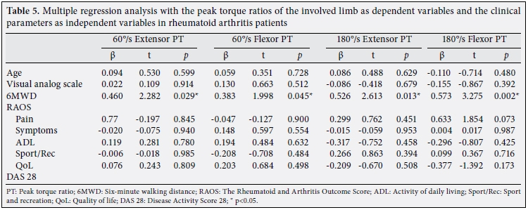 The relationship between the PT ratios and clinical parameters in the OA and RA patients according to multivariate linear regression analysis is shown in Tables 4 and 5. We found a statistically significant correlation with the PT ratios regarding the 6MWD in both patient groups (p<0.05) (Tables 4 and 5), but no notable correlations were seen between the PT ratios, and age and VAS pain (p>0.05) (Tables 4 and 5). In the OA patients, only the Sport/Rec subscale was associated with the PT ratios of the knee extension and flexion at 60°/s and knee extension at 180°/s (p<0.05) (Table 4). The PT ratios of knee flexion at 180°/s were also associated with the symptom and Sport/Rec subscales in this patient group (p<0.05) (Table 4). In the RA patients, no statistically significant correlations were found between the PT ratios, and the RAOS subscales and DAS 28 (p>0.05) (Table 5). Lastly, no significant effects of the radiological grade were seen with regard to the 6MWD, RAOS subscales, and PT ratios when they were evaluated by univariate ANOVA (p>0.05).