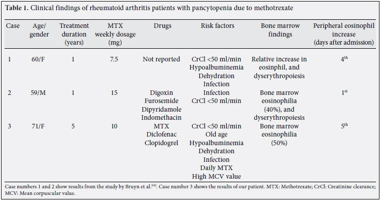 A 71-year-old female patient who had suffered from seropositive RA for 35 years was admitted to our health center with complaints of diarrhea, weakness, mouth sores, and dysphagia. She had a temperature of 37.8 °C and a pulse rate of 90 beats per minute, and her blood pressure was 120/80 mmHg. A physical examination revealed dehydration with oral mucositis and ulcers, but no signs of active synovitis were observed (DAS 28 score of 3.19). A laboratory examination showed the following: an erythrocyte sedimentation rate (ESR) of 77 mm/h, hemoglobin (Hb) of 7.18 gr/dl (normal range 12-16), mean corpuscular volume (MCV) of 100 fL (normal range 81-99), a white blood cell (WBC) count of 0.572x103/ul (normal range 4-10), an absolute neutrophil count (ANC) of 0.016x103/ul (normal range 2-6.9), an absolute lymphocyte count (ALC) of 0.299x103/ul (normal range 0.6-3.4), an absolute monocyte count (AMC) of 0.174x103/ul (normal range 0-0.9), an absolute eosinophil count (AEC) of 0.01x103/ ul (normal range 0-0.9), and a platelet count of 8.885x103/ul (normal range 150-450. In addition, the examination revealed an aspartate aminotransferase (AST) level of 35 U/L, an alanine aminotransferase (ALT) level of 30 U/L, a creatinine level of 1.1 mg/dl, a creatinine clearance of <50 ml/min, an albumin level of 3.1 mg/dl, a C-reactive protein (CRP) level of 221 mg/dl, and a folic acid level of 5.1 ng/ml (5-16). After obtaining these results, the patient consulted with the hematology department because of her pancytopenic condition. Her medical history was unremarkable except for the cerebrovascular disease. The patient had been followed up by the Department of Physical Medicine and Rehabilitation for RA and had been receiving 2.5 mg/day of MTX three days a week (7.5 mg/week), 100 mg/day of NSAIDs, such as diclofenac, and 75 mg/day of clopidogrel for her cerebral ischemia over the previous five-year period. The MTX dose was then increased to 10 mg/week (2.5 mg/day, four days a week). The patient had been taking this amount for one month. She was hospitalized for pancytopenia by the hematology clinic, and the MTX, NSAIDs, and clopidogrel were discontinued. The patient was given erythrocyte and platelet transfusion, and was started on systemic fluconazole for oral candidiasis and a combination of piperacillin/tazobactam for a urinary tract infection (UTI). To identify the etiology of the pancytopenia, several laboratory examinations and bone marrow aspiration were conducted. The patient's thyroid hormones, antinuclear antibodies (ANA), antidouble- stranded deoxyribonucleic acid (anti-dsDNA), immunoglobulin G (IgG), IgA, IgM, vitamin B12, and folic acid levels were normal, but she tested negative for hepatitis markers, brucellosis, and salmonella. Abdominal ultrasonography (USG) revealed normal findings, with no hepatomegaly, splenomegaly, or lymphadenopathy. The bone marrow aspiration showed hypocellularity and significantly increased eosinophilic precursors. In the bone marrow biopsy, 30% cellularity, a small number of micromegakaryocytes, decreased erythroid and myeloid series elements, significantly increased eosinophilic precursors, and hypocellularity were observed, but there was no increase in the blastic series (Figure 1). Folic acid and granulocyte colony-stimulating factor (G-CSF) were then prescribed. A laboratory examination three days after treatment with the G-CSF showed Hb of 10.3 g/dl, WBC of 6.52x103/ul, ANC of 3.92x103/ul, AEC of 0.012x103/ul, and platelet levels of 20.1x103/ul. Furthermore, complete blood count results five days after the discontinuation of MTX revealed Hb of 10.2 gr/dl, WBC of 23.7x103/ul, ANC of 16.7x103/ul, AEC of 1.07x103/ul, and a platelet count of 20.8x103/ul (Figure 2). Twenty days after the discontinuation of MTX, the blood abnormalities resolved completely.