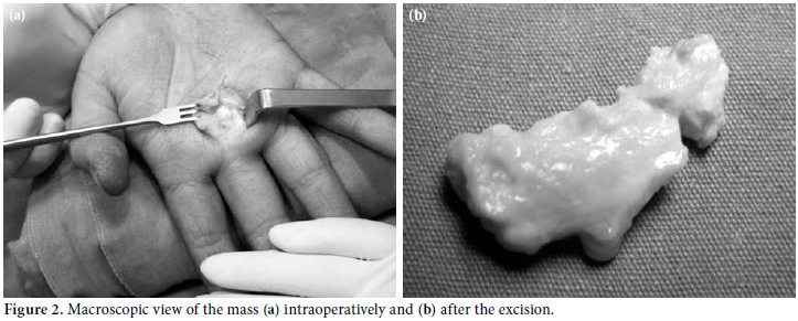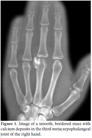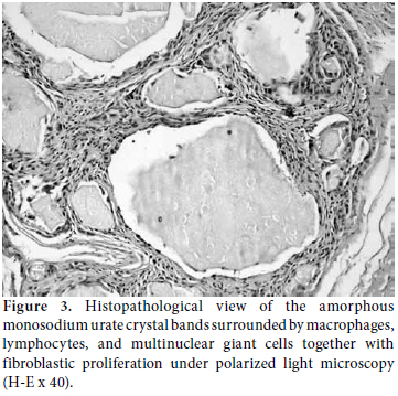 A 30-year-old female patient came to our clinic complaining of pain and swelling in the third metacarpophalangeal joint of the right hand. She described a slowly growing mass and progressively increasing pain in this joint, especially when she made a fist. A semi-rigid, fixed mass of approximately 2.5x1 cm in size was palpated in the physical examination of the patient, but there was no redness or feeling of heat emanating from it. Hand functions, such as grasping or holding, along with finger mobility were within normal limits. In addition, the patient had no other systemic symptoms or findings of arthritis such as fever, arthralgia, or swelling in the joint. A mass composed of calcium deposits was present in the third metacarpophalangeal joint of the right hand in the X-ray radiographs (Figure 1). The patient's medical history revealed nothing of consequence, and the plasma uric acid level and other routine preoperative blood tests were within normal limits, except for a slightly elevated level of the plasma pseudocholinesterase enzyme activity. While the mass lesion was dissected from the surrounding soft tissues, a milky fluid was discharged, A 2.5x1x0.5 cm size rubbery mass with a rigid center was then removed (Figure 2). Amorphous monosodium urate crystal bands surrounded by macrophages, lymphocytes, and multinuclear giant cells together with fibroblastic proliferation associated with tophaceous gout were encountered under polarized light in the histopathological examination of the removed mass (Figure 3). A detailed physical examination along with more laboratory tests and radiographs were performed after the histopathological diagnosis, and all were normal. After a one-year follow-up, the patient's plasma uric acid levels were still within the normal limits, and there had been no acute attack of arthritis. The patient was free of pain, and her hand functions were satisfactory.