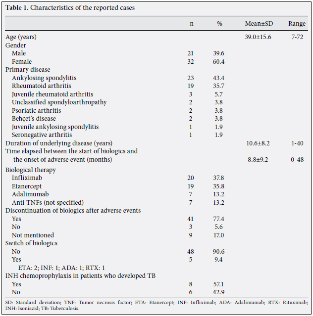 Table 3 summarizes the information of all 53 cases together. The most common adverse event was TB in 14 patients (26.4%), and five of these were treated with infliximab, two with etanercept, and one with adalimumab. Six others were reported as “treated with TNF inhibitors”. Furthermore, 12 (22.6%) of the 14 had pulmonary TB while two (3.8%) had extrapulmonary TB. In addition, we discovered that chemoprophylaxis was administered for eight (57.1%) of the 14 TB patients.