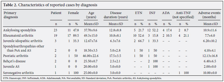 Infliximab was used to treat 20 patients (37.7%) while etanercept was used for 19 others (35.8%). Adalimumab was the treatment of choice for seven more (13.2%). However, which anti-TNF was used has not been specified in seven patients (13.2%). Patients with RA reported more adverse effects when taking etanercept, whereas AS patients had more problems with infliximab. The elapsed time between the initiation of the biologics and the onset of adverse events was 10.9±11.6 months for patients with AS and 7.7±6.0 months for those with RA.