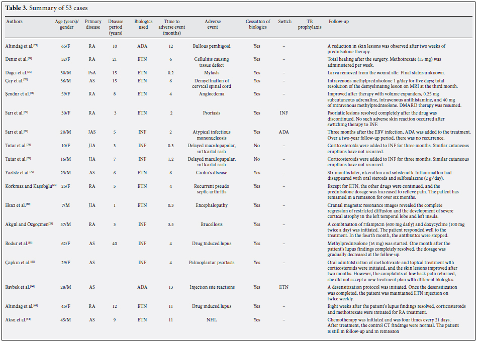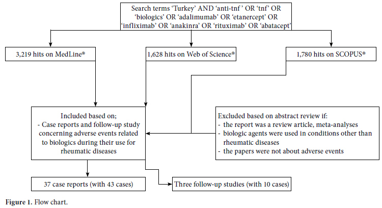 Patients and methods: Between January 2000 and January 2012, the literature was searched in English and Turkish for case reports and case series using the MedLine, Web of Science, and Scopus databases reporting adverse effects related to the use of biological agents including infliximab, etanercept, adalimumab, anakinra, rituximab which were used for the treatment of rheumatic diseases.